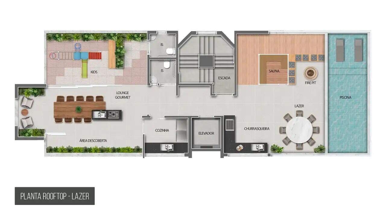 O Edifício possui fachada revestida em porcelanato e cerâmica, arquitetura contemporânea e uma área de lazer completa no rooftop, com piscina com deck molhado, terraço gourmet com churrasqueira, espaço kids, pet place, espaço fitness e espaço grill, tudo isso com vista definitiva e um ambiente projetado para relaxar.