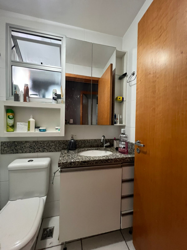 Banheiros (social e suíte) com excelente acabamento, espelho, armário e box em blindex.