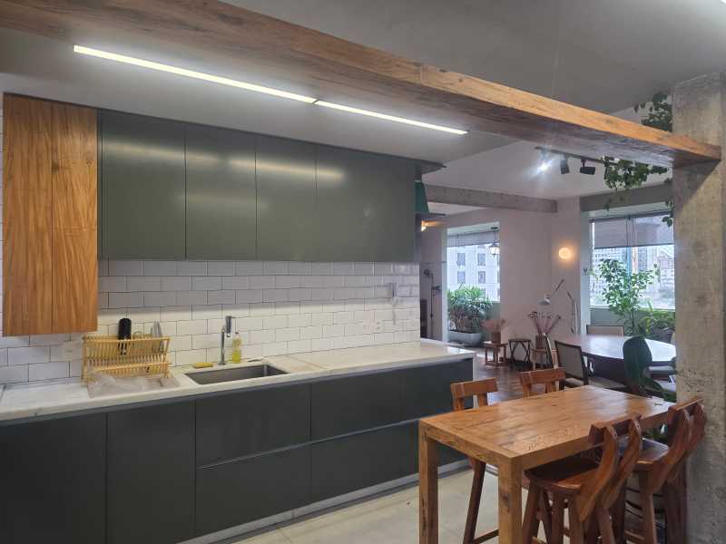 Destaque para a varanda integrada, que foi aberta e ganhou um deck agradável, com plantas e árvores frutíferas em vasos, criando um espaço especial de descanso no meio da cidade.