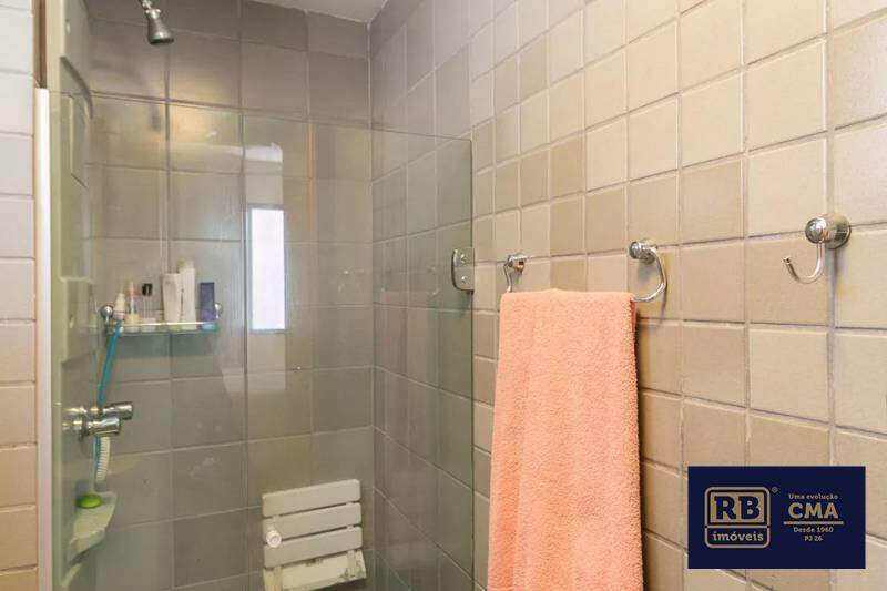 Banheiro social com bancada em granito, espelho, armários e box em blindex