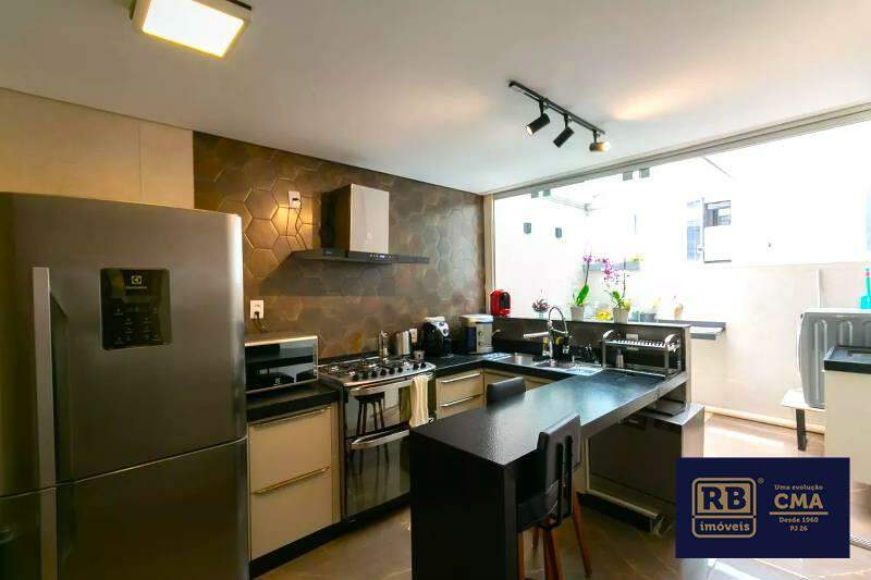 Cozinha ampla e funcional, com piso em porcelanato, móveis totalmente planejados, bancada em granito preto, iluminação planejada e coifa