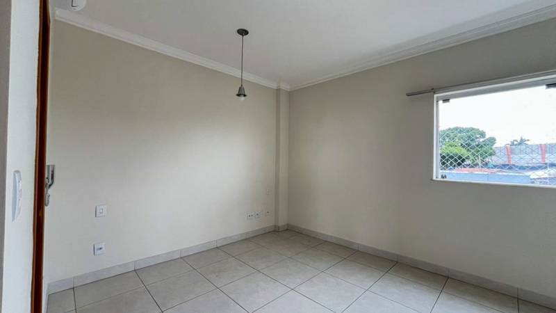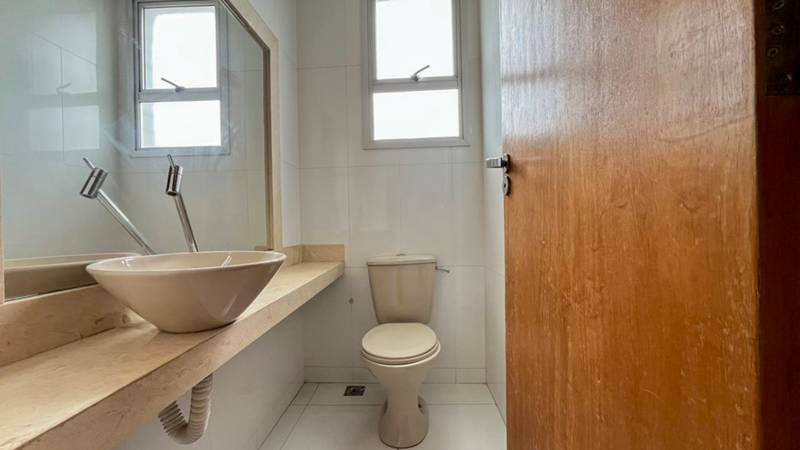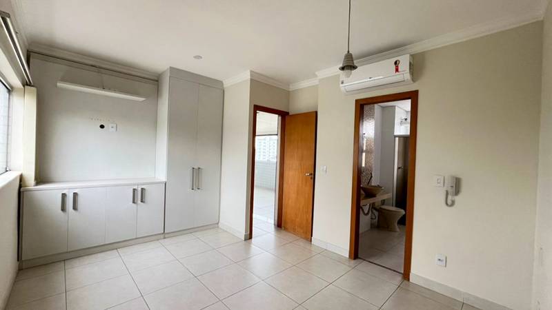 1 Quarto amplo, com piso em porcelanato e armários, sendo a suíte com bancada em granito, pia em cuba de apoio, espelho e box em blindex