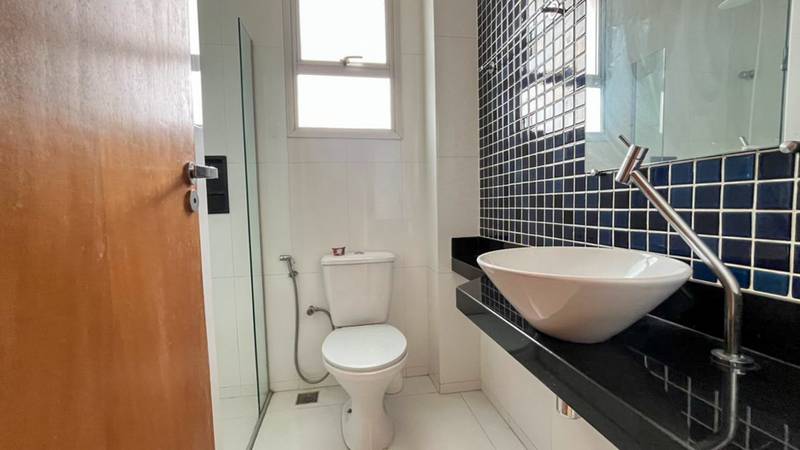 Banheiro social com bancada em granito, pia em cuba de apoio, espelho e box em blindex