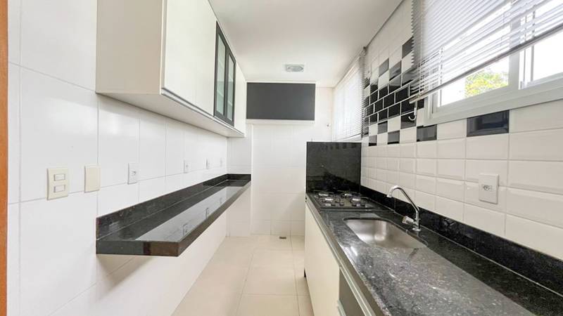 Cozinha espaçosa, com bancada em granito, piso em porcelanato e armários planejados