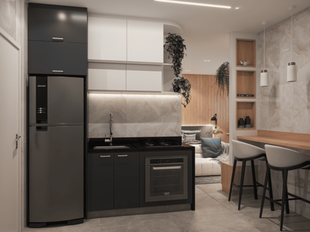 Ambientes integral com piso em porcelanato. Banheiro e cozinha com revestimento em cerâmica.